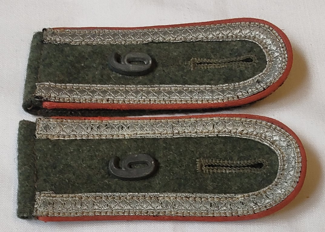 The neat shoulder straps which measure approximately 11.5 cms size in length have the 'standard type' field-grey coloure woolen based 'upper decks' and have (as to be expected) the bright-pink 'rosaroter' coloured desirable 'silk-like' type piping attached, each strap has silvered tress and zinc 9 numerals attached, (as can be seen on the pictures).