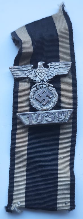 This is an issued and worn award that was attached to the tunic of the service uniform through the second button hole. The award was made during WW2 to those recipients who had been awarded the Iron Cross 2nd class during WW1, thus the bar in the form of an eagle was awarded for a subsequent award of the EK 2.