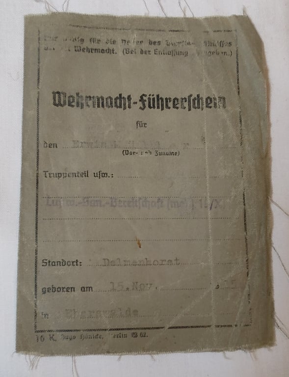 Original German Luftwaffe (Fallschirmjäger) medic - Führerschein issued to Erwin Müller who served in Luftw.-San.- Bereitschaft (Mot.) 16/XI.. he was awarded the 2nd class drivers badge on the 17th August 1940.