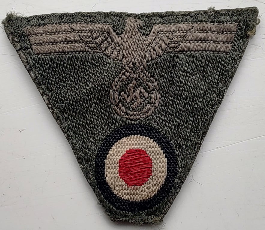 WH (Heeres) M43 pattern cap eagle and cocarde trapezoid as was specifically produced for usage on the M 43 model field-caps, the trapezoid has been folded and removed from a cap. The trapezoid is made of the Bevo form and is in overall very good condition.