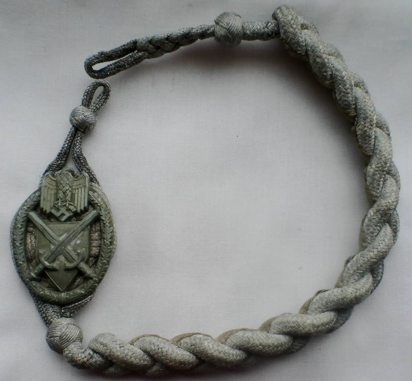 Historical Description: Marksmanship was a highly valued skill in the militaristic culture of the Third Reich. For soldiers, of course, this skill was taught and trained, and soldiers were expected to achieve marksmanship proficiency. Members of paramilitary organizations such as the Hitler Youth also trained with the use of weapons, and of course there were civilian shooting clubs that held events and competitions as well. There was a myriad of different kinds of marksmanship awards that were used to recognize this skill. In the SS, and early in the German Wehrmacht, sleeve insignia was used in different patterns to display different levels of rifle qualification. Later, the Heer and Luftwaffe used special lanyards for this purpose. Heer and Luftwaffe lanyards used distinctive emblem patterns, as did the Panzer branch of the Heer. The lanyards were produced in many different grades for which a soldier could qualify and were not worn on the field uniform. Because of this, issue of these lanyards was discontinued around the start of WWII. Civilian and paramilitary groups had their own wide array of different marksmanship awards, ranging from pins and badges to non-portable medals and award plaques.