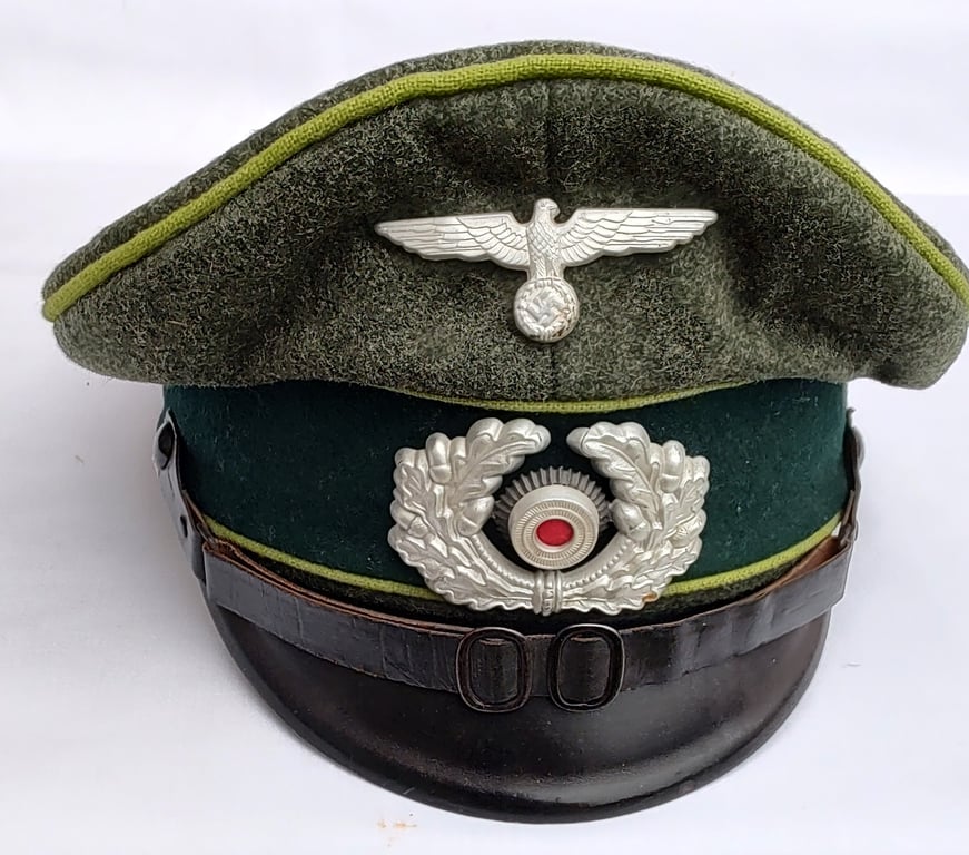 The cap comes with light traces of wear and age and has no moth or other damage then traces of use, cap comes in the light green colour of the Panzer Grenadier troops and is of a mid war manufacture, the cap is not maker marked and does not have the sweat shield anymore.