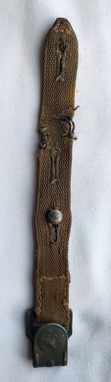 Nice and original short strap for a M31 German gas mask canister. The hook still has the original field grey paint and has the stud for attaching the short strap.