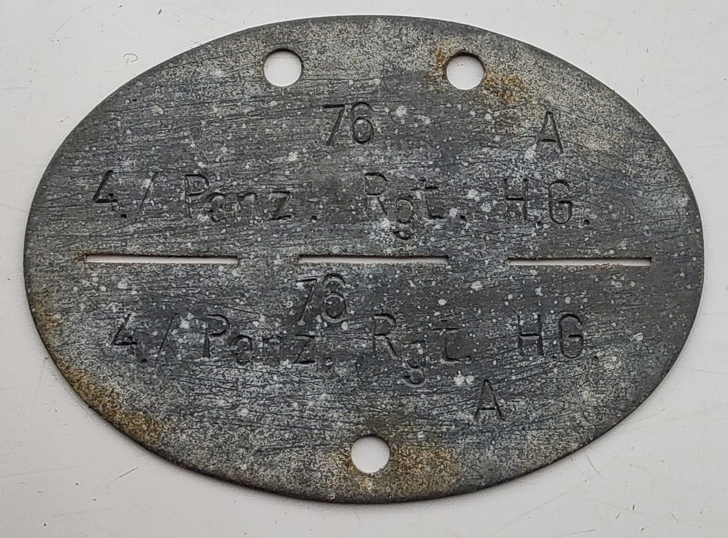 The disc is made from zinc and has the following stamped onto the front. 4/Panz. Rgt.HG and soldiers id 76 and blood group A.
