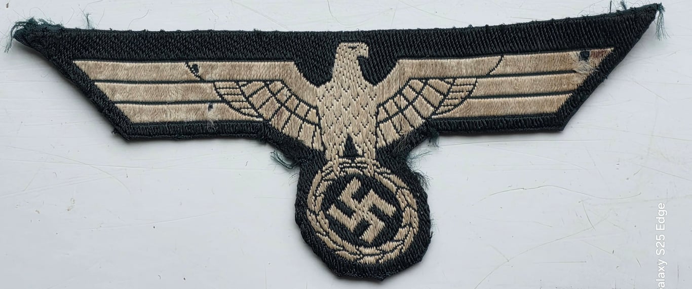 A WW2 Heer M38 bevo breast eagle that has been worn and removed from a tunic. Has some wear and staining from being worn.