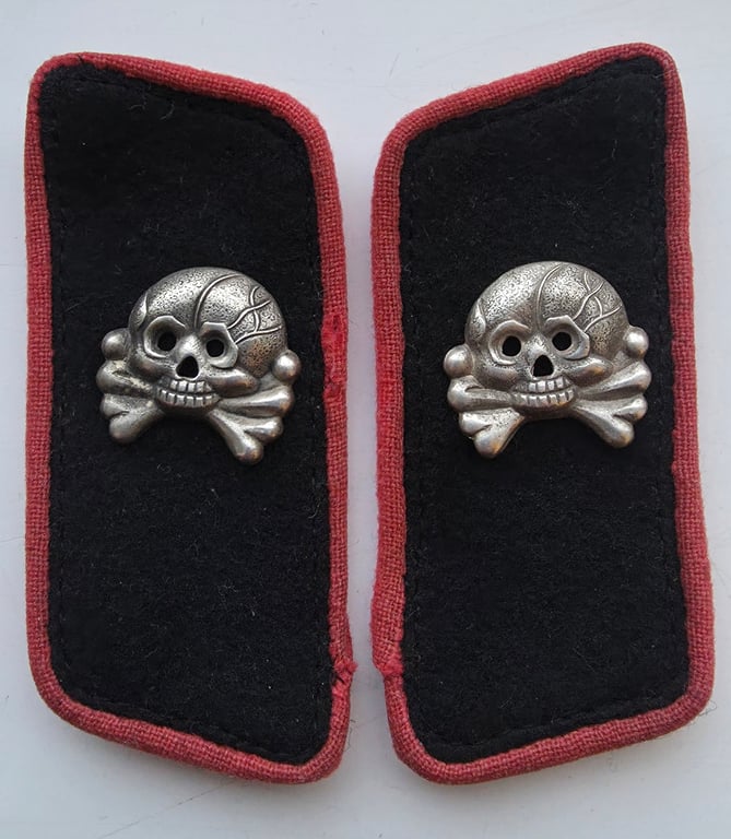 Post 1940 construction featuring early skulls in aluminium attached to black wool cloth backing with pink panzer wool waffenfarbe attached.