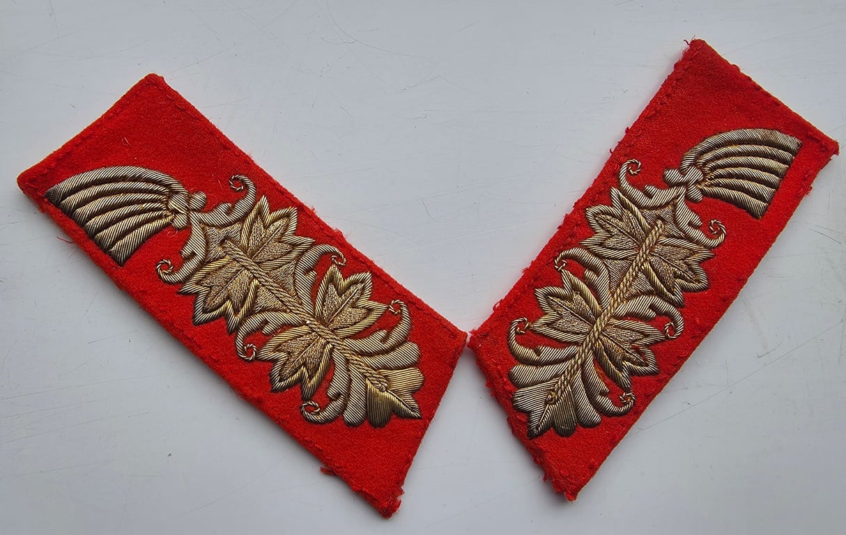 A matching set of Wehrmacht Kragenspiegel für General collar tabs, both constructed of red wool without a buckram core, the obverse of each bearing gold bullion litzen, both unmarked and measuring 39 mm (w) x 95 mm (l), in issued, worn used and tunic removed condition.