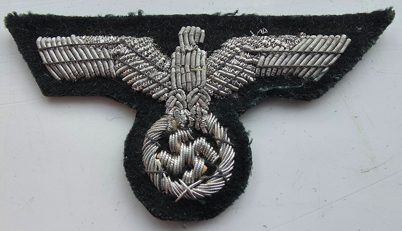 This is an attractive non issued, worn but very detailed and actually not that easily encountered hand embroidered WH (Heeres) officers pattern visor cap eagle (Adler für Schirmmütze) that comes mounted onto an dark green coloured woolen based background with the original backing paper still attached and not damaged l.