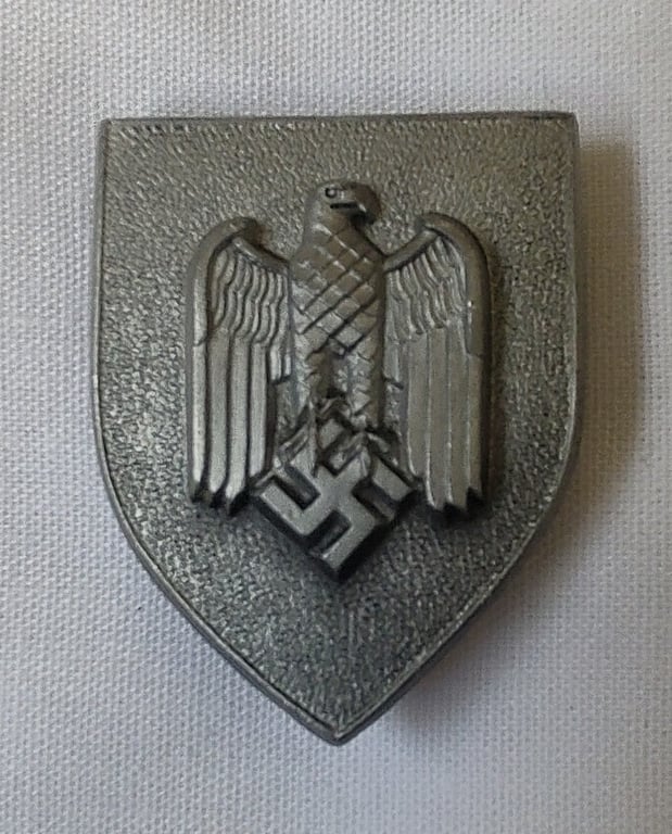 WWII German Heer schützenschnur 1st pattern shield in good used condition. The shield shows good detail with all three pins in place on the back.