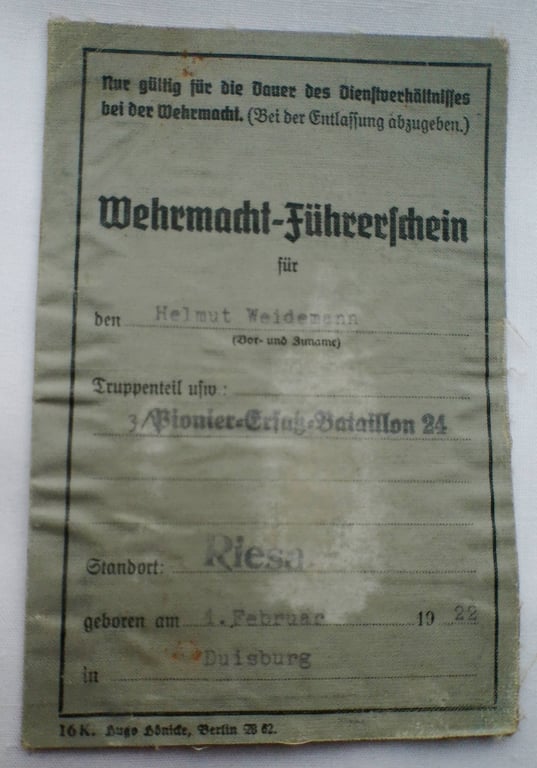 Original German Wehrmacht - Führerschein issued to Helmut Weidemann who served in Pionier Ersatz Battalion 24. Was awarded both the third class and 2nd class in January 1942.