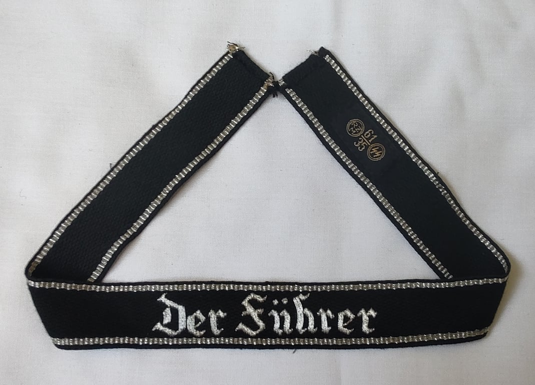 Reproduction Waffen-SS Officer "Der Führer RZM flat wire cuff title...The cuff title is the RZM variant of the second pattern flat wire DF cuff title, this piece is very convincing from the front and is very well made and would fool a lot of collectors..this has been in my collection for many years and now that I have an original one I am letting this one go. Has some wear and aging to both the front and rear, also has the RZM tab sewn to the rear.