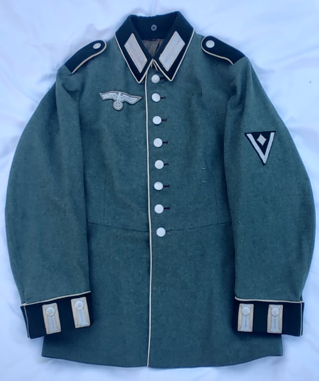 The M35 dress tunic was introduced for wear by all ranks on June 29TH 1935 as the walking out, parade and ceremonial dress with the piped, stone grey long pants. The design of the M35 dress tunic was based on the Imperial German army’s service tunic but was a different color and generally of much higher quality. Originally all personnel were issued two M35 dress tunics, but manufacture was discontinued in late 1939 or early 1940 and was to be reinstated at the successful conclusion of the war. Regulations of March 21ST 1940 stated that the M35 dress tunics that were no longer suitable for dress wear were to be modified and reissued to personnel of the replacement and reserve units for everyday wear. Officers and certain senior NCO ranks were responsible for purchasing their own uniforms and as a result were allotted a clothing allowance through the army’s Kleiderkasse, (Clothing Account), system. The Officers and certain senior NCO’s could choose to purchase their uniforms from the armed forces clothing depots or to privately purchase garments of higher quality. Although enlisted personnel were issued their uniforms from government supplies, they were also permitted to purchase privately tailored uniforms although the price may have been restrictive. 100% Guaranteed to be authentic. Sold for historic purposes only.
