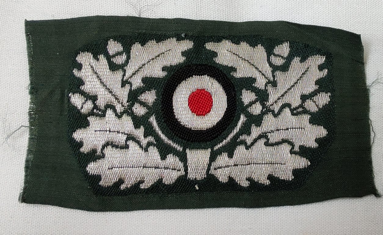This is an attractive, simply never used and actually not that easily encountered WH (Heeres) officers type visor cap cocarde as executed in so called 'flat-wire' ie. 'BeVo' weave pattern, this was specifically intended for usage on the: WH 'Knautschmützen' ie 'Alter-art' visor cap (ie 'Schirmmützen') and that comes in an overall nice ( never visor cap attached, 'virtually mint') condition.